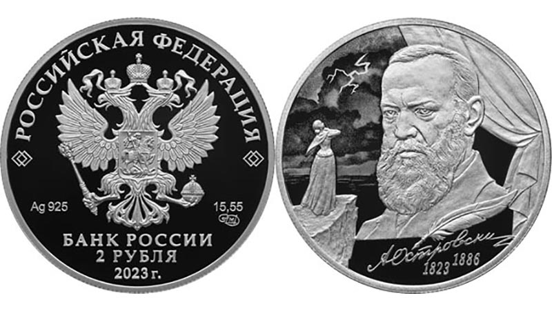 Именно сюжет из пьесы «Гроза», выполненный в рельефе и в технологии лазерного матирования, художники-медальеры изобразили на обороте серебряной монеты, посвященной 200-летию со дня рождения Островского. Там же справа расположено рельефное изображение портрета самого драматурга на фоне поднятой театральной кулисы, а внизу – рельефное изображение пера, факсимиле подписи Александра Николаевича и годы его жизни: «1823» и «1886».
