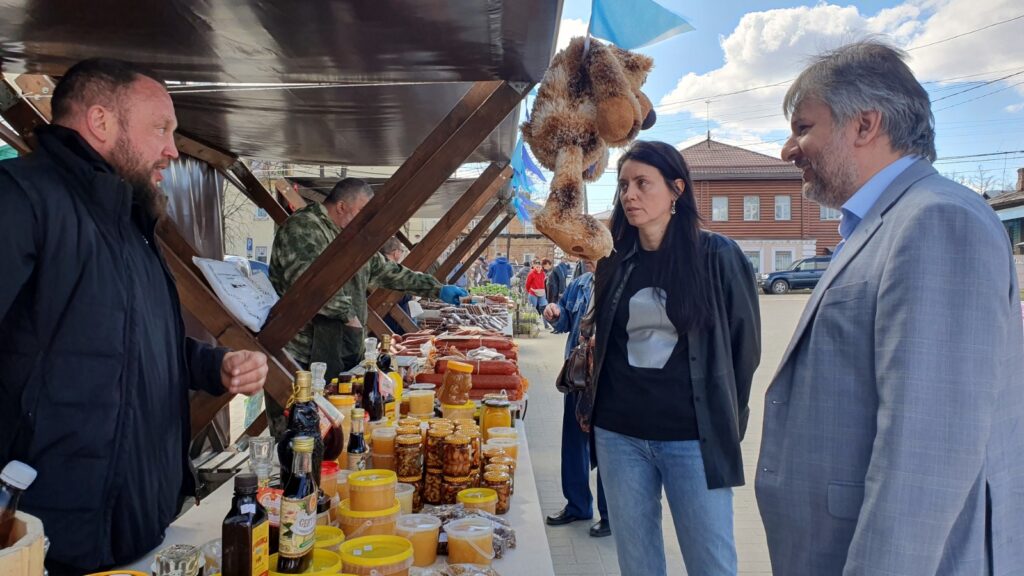 Заместитель председателя Общественной палаты Анжелика Гатаулина и директор Департамента сельского хозяйства и продовольствия Денис Черкесов на ярмарке в Кинешме.