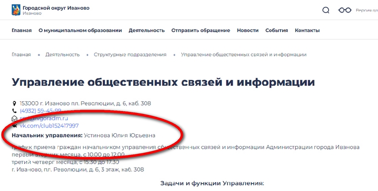 С этим назначением сложилась веселая ситуация. Вот уже несколько дней (как минимум, с пятницы, 21 июня), если посмотреть в разделе «Структурные подразделения» официального сайта администрации города Иваново, то Юлия Юрьевна действительно является начальником управления общественных связей и информации мэрии.