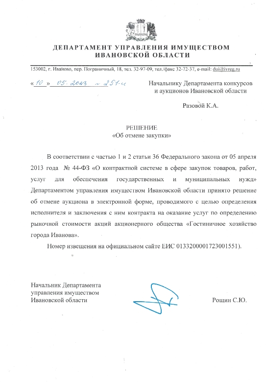 Насчет акций АО «Гостиничное хозяйство города Иванова» Автор: Александр Элькинд Департамент управления имуществом Ивановской области без объяснения причин отменил торги на право подписания контракта на оказание услуг по
