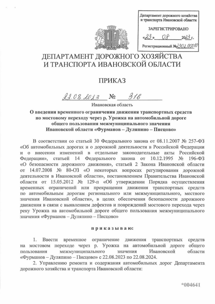 В связи с выявлением дефектов и повреждений моста через реку Урожка на автодороге общего пользования межмуниципального значения Фурманов – Дуляпино – Писцово департамент дорожного хозяйства и транспорта Ивановской области временно (до 22 августа 2024 года) ограничил по нему движение.