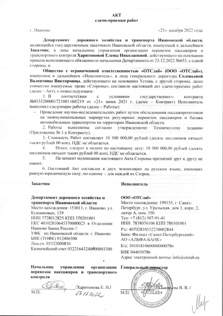 Вроде бы тема зависла, и надолго. Но вот – новый поворот: 23 декабря 2022 года госпожа Харитонова, начальник управления организации перевозок пассажиров и транспортного контроля департамента дорожного хозяйства, подписывает акт сдачи-приемки выполненных работ, в котором русским по белому написано, что работы по контракту ООО «ОТС Лаб» выполнило в полном объеме. И 28 декабря департамент финансов оплачивает исполнителю эти работы – 10,5 млн рублей. Все эти документы есть в открытом доступе на сайте госзакупок.