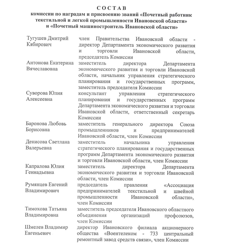Текст приказа ДЭРиТа «О комиссии по наградам и присвоению званий «Почетный работник текстильной и легкой промышленности Ивановской области» и «Почетный машиностроитель Ивановской области» в полном объеме см. здесь .