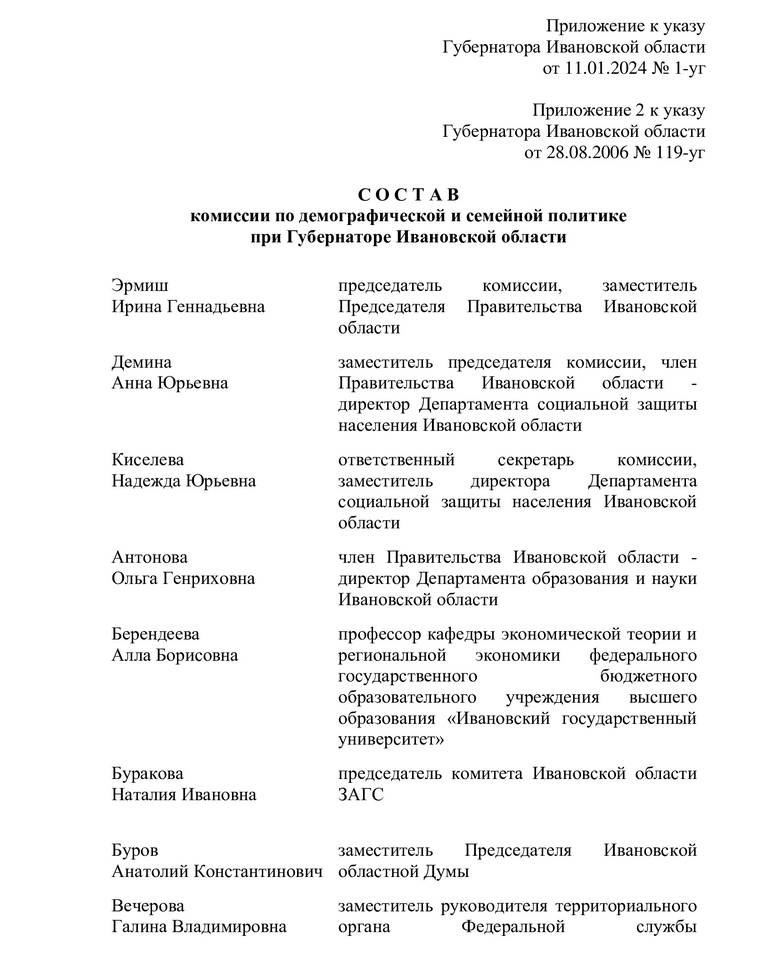 В связи с кадровыми и структурными изменениями губернатор Ивановской области Станислав Воскресенский указом № 1 от 11 января 2024 года капитально обновил состав комиссии по демографической и семейной политике под руководством Ирины Эрниш. Теперь он выглядит так:
