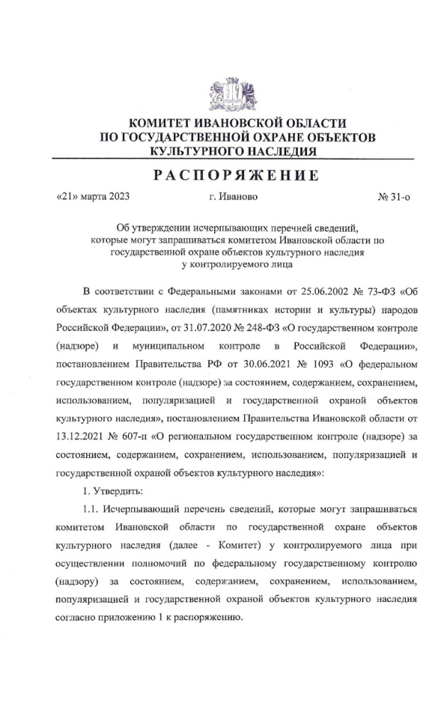 Всё, что чиновники хотят знать Автор: Александр Элькинд Комитет Ивановской области по государственной охране объектов культурного наследия 21 марта этого года разразился распоряжением «Об утверждении исчерпывающих перечн
