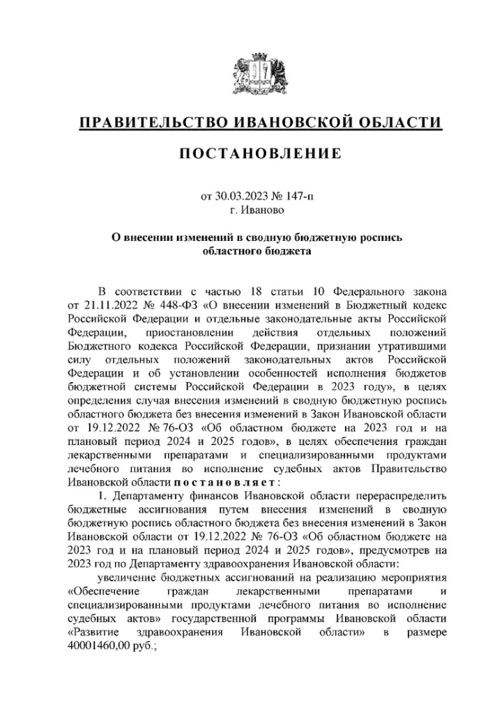 В конце марта 2023 года постановлением правительства Ивановской области N 147-п были внесены очередные изменения в сводную бюджетную роспись областного бюджета. Если конкретно, то увеличены бюджетные ассигнования на обеспечение граждан лекарствами и т.д. во исполнение судебных актов в размере 40 001 460 рублей.