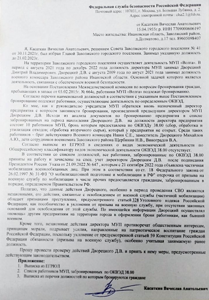 По версии Касссаткина Дворецкий, с августа 2009 года по август 2021-го занимавший должность военного комиссара Заволжского района Ивановской области, в бытность директором МУПА незаконно предоставил бронь десяти сотрудникам МУПа по ОКВЭДу 38.00 (сбор, обработка и утилизация отходов; обработка вторичного сырья). Среди этих работников брат действующего военкома Ишин, заместитель Дворецкого Михайлов, дети сотрудников военкомата Заволжского района Щербинин и Виноградов.