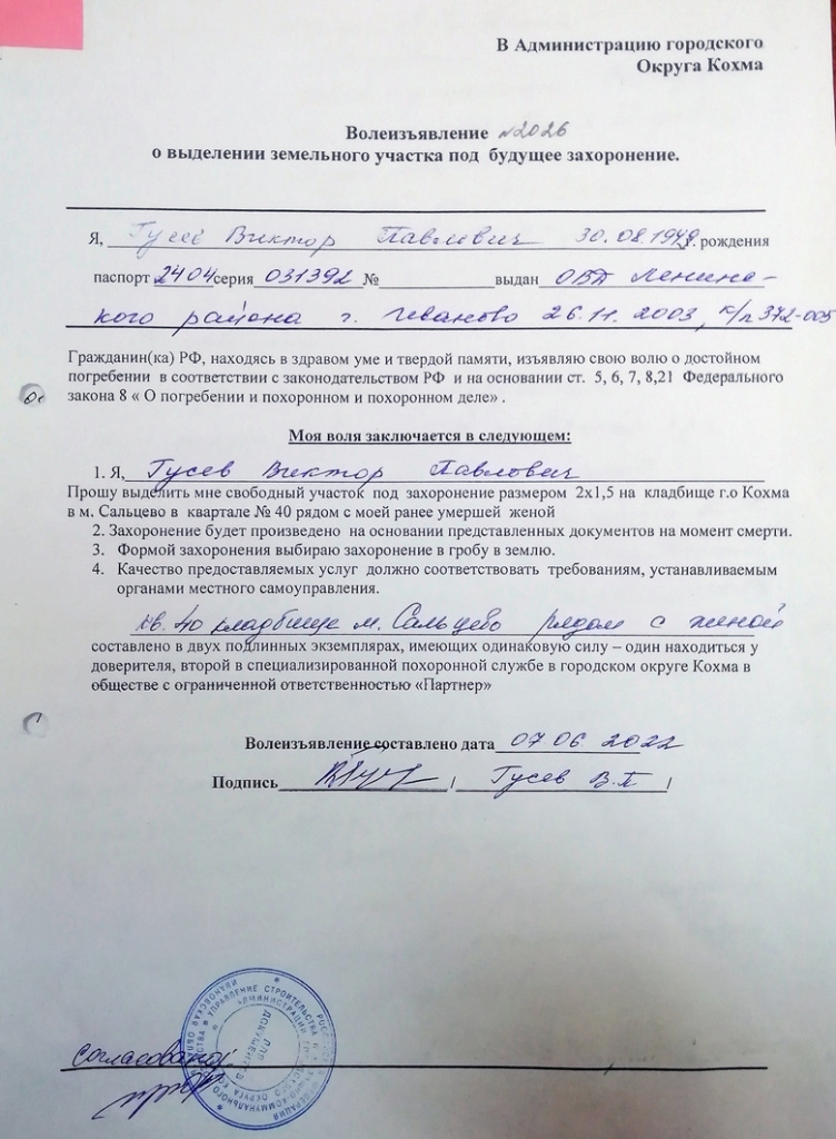 Виктор Павлович десять месяцев назад написал в администрацию городского округа Кохма заявление с волеизъявлением быть захороненным рядом с умершей ранее супругой. И ему, как и положено законом, выделили этот земельный участок размером 2х3 метра под семейное захоронение. Документ подписала первый заместитель начальника управления строительства и жилищно-коммунального хозяйства администрации городского округа Кохма Марина Жукова.
