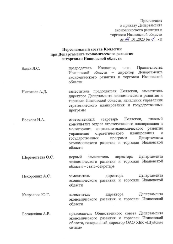 17 января руководитель ДЭРиТа Людмила Бадак подписала первый в 2023 году приказ «Об утверждении персонального состава Коллегии при Департаменте экономического развития и торговли Ивановской области». В состав коллегии под руководством непосредственно госпожи Бадак вошли несколько ее заместителей, еще парочка чиновников из самого департамента, гендиректор «Шуйских ситцев» Богаделина и директор АНО «Центр развития предпринимательства и поддержки экспорта Ивановской области» Корнилова.