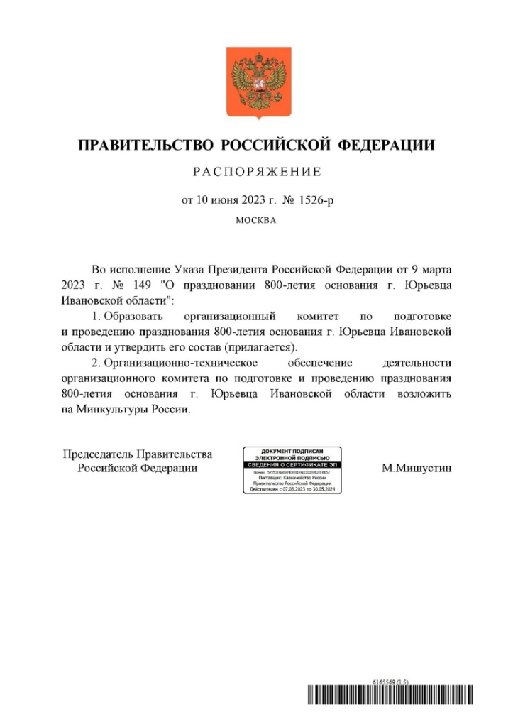Автор: Александр Элькинд Глава кабмина Михаил Мишустин 10 июня 2023 года подписал распоряжение Правительства РФ о создании организационного комитета по подготовке и проведению празднования 800-летия древнейшего города Ивановской области – Юрьевца.