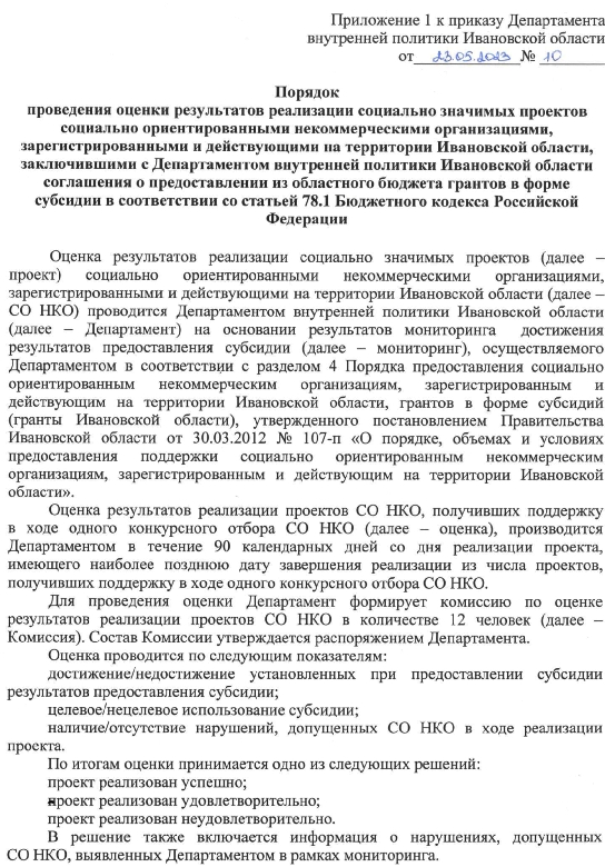 Начальник ДВП региона Антон Горбунов 23 мая 2023 года завизировал приказ «О порядке проведения оценки результатов реализации социально значимых проектов социально ориентированными некоммерческими организациями, зарегистрированными и действующими на территории Ивановской области, заключившими с Департаментом внутренней политики Ивановской области соглашения о предоставлении из областного бюджета грантов в форме субсидий в соответствии со статьей 78.1 Бюджетного кодекса Российской Федерации».