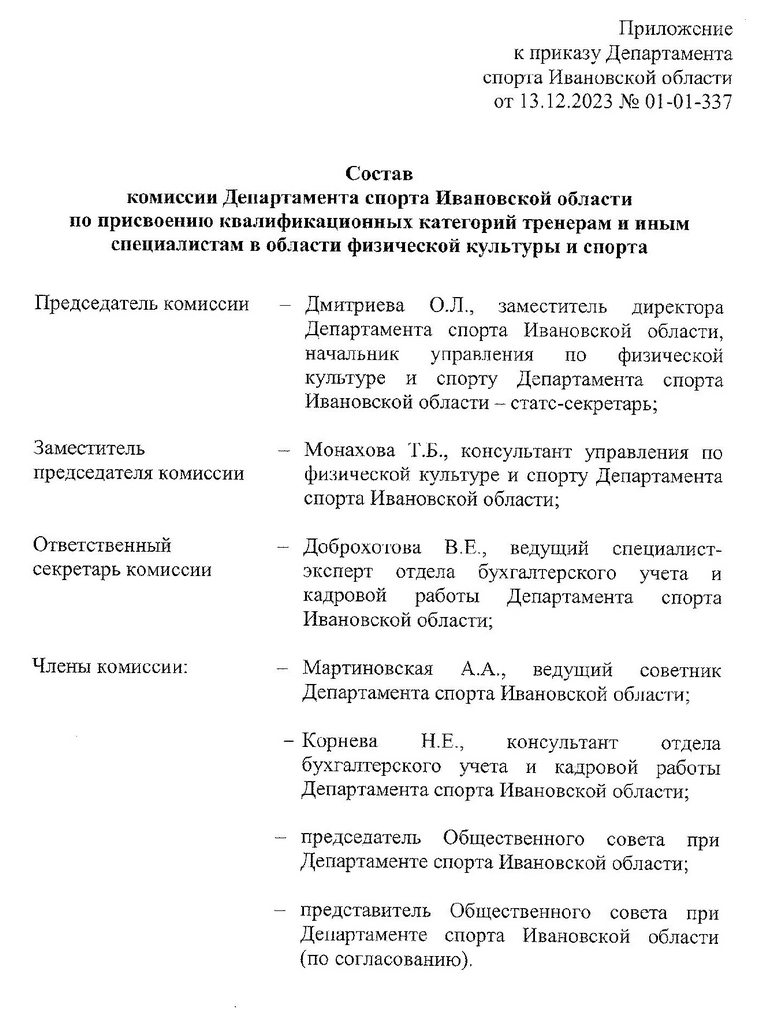 Член правительства Ивановской области – директор департамента спорта Татьяна Сидоренкова 13 декабря этого года завизировала приказ, актуализирующий состав комиссии ведомства по присвоению квалификационных категорий тренерам и иным специалистам в области физической культуры и спорта. Возглавила комиссию Ольга Дмитриева, замдиректора спортивного департамента Ивановской области.