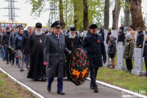 На городском кладбище благочинный Фурмановского района протоиерей Владимир поздравил всех присутствующих с Днем Победы, а затем учащиеся образовательных учреждений, представители администрации, депутатского корпуса и городской общественности возложили цветы к обелиску и воинским захоронениям.