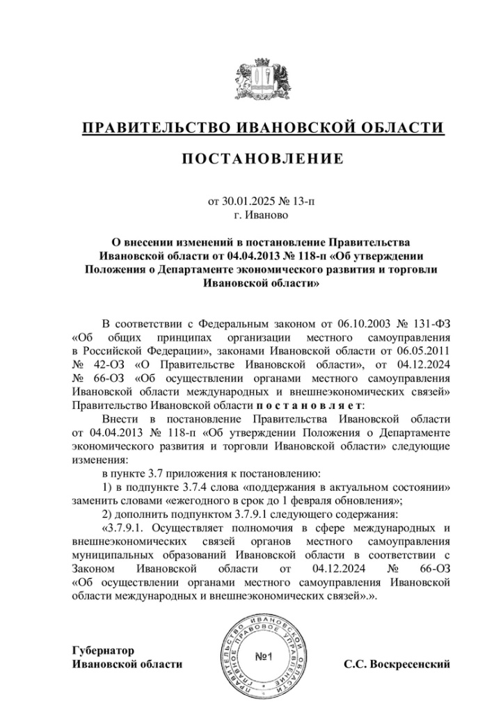 Постановлением правительства Ивановской области от 30 января 2025 года внесены изменения в положение о департаменте экономического развития и торговли региона.