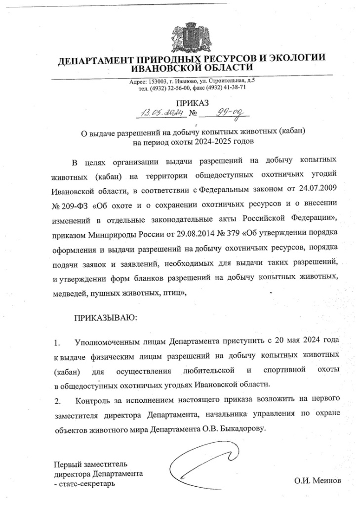 13 мая 2024 года был подписан приказ департамента природных ресурсов и экологии Ивановской области «О выдаче разрешений на добычу копытных животных (кабан) на период охоты 2024-2025 годов» (см. ниже).