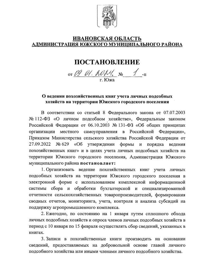 Первым документом, который подписал в 2024 году глава Южского района Ивановской области Владимир Оврашко стало постановление администрации муниципалитета «О ведении похозяйственных книг учета на территории Южского городского поселения».