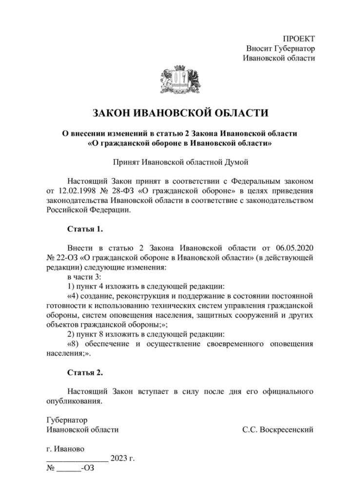 Плюсом к созданию и поддержанию Автор: Александр Элькинд Подготовлен проект закона Ивановской области «О внесении изменений в статью 2 Закона Ивановской области «О гражданской обороне в Ивановской области»».