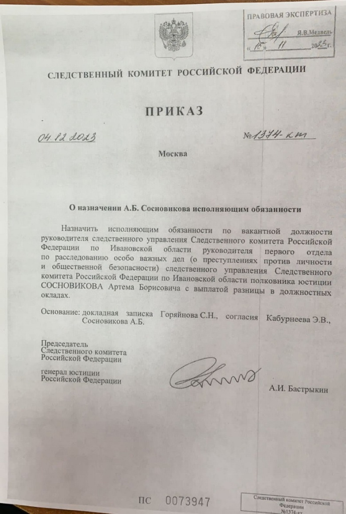 Автор: Алексей Машкевич Как мы и предполагали , новым руководителем Следственного управления Следственного комитета по Ивановской области назначен полковник юстиции Артём Сосновиков.