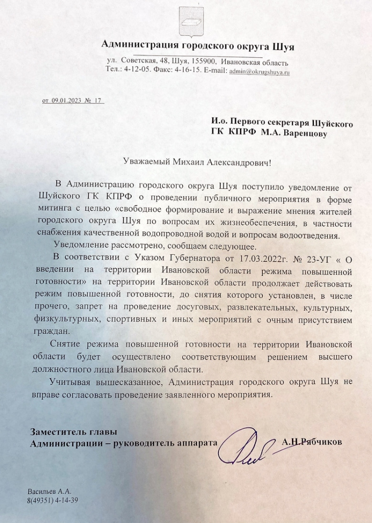 На прошлой неделе шуйская администрация напомнила всем людям доброй воли, что у нас в <нашей любимой> Ивановской области вообще-то режим повышенной готовности действует. Если кто забыл, напомню: ивановские коммунисты направили в администрацию Шуи уведомление о проведении митинга по поводу качества водоснабжения, а замглавы города господин Рябчиков ответил им, что указом губернатора № 23-УГ в регионе введен режим повышенной готовности, «до снятия которого установлен, в числе прочего, запрет на проведение досуговых, развлекательных <…> и иных мероприятий с очным присутствием граждан».