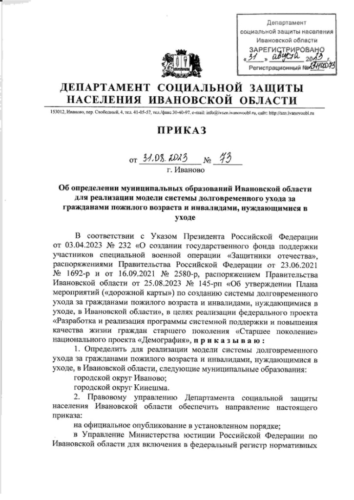 Руководитель департамента соцзащиты региона Татьяна Рожкова 31 августа 2023 года завизировала приказ ведомства под названием «Об определении муниципальных образований Ивановской области для реализации модели системы долговременного ухода за гражданами пожилого возраста и инвалидами, нуждающимися в уходе». Данными муниципалитетами объявлены города Иваново и Кинешма.