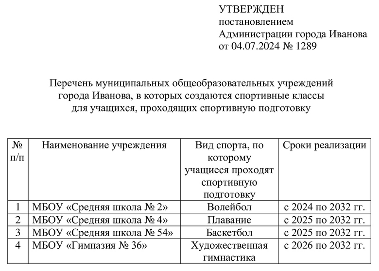 По постановлению мэрии Автор: Александр Элькинд Администрация города Иваново 4 июля 2024 года утвердила перечень муниципальных общеобразовательных учреждений областного центра, в которых создаются спортивные классы для учащихся,