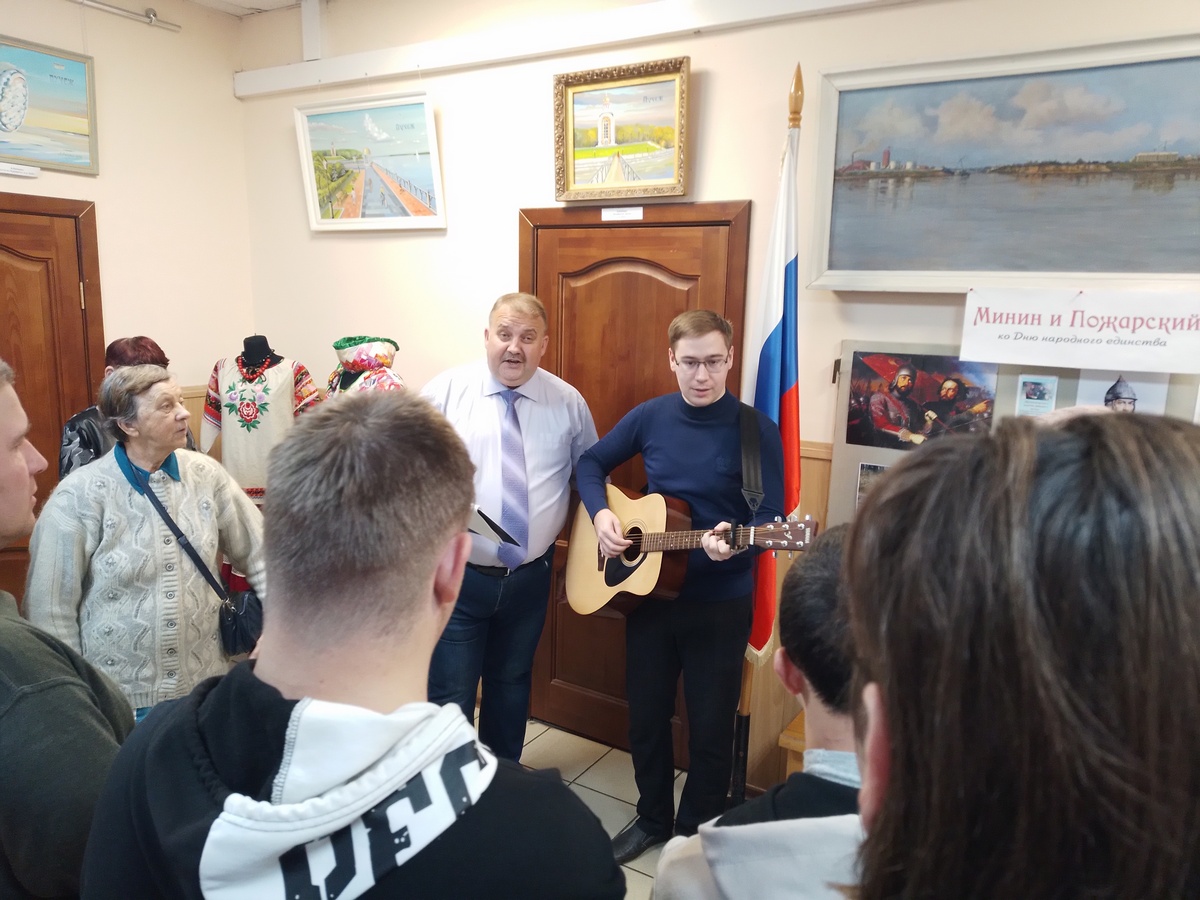 В фойе музея гостей встречал директор М. Мартюнин, который поздравил всех с праздником. Научный сотрудник С.В. Смирнов рассказал об исторических местах Пучежского района, связанных с походом народного ополчения К. Минина и Д. Пожарского. Своё стихотворение "Давайте жить по солнечным часам" прочитала Галина Чернова. А затем посетители окунулись в мир живописных картин и графики из экспозиции А. Мучкаева "Любимая сердцем земля". Живейший интерес и восторг вызвали у посетителей песнопения Русской Православной Церкви, прозвучавшие на звуковоспроизводящей аппаратуре. Эти пластинки выпущены в 1988 г. к тысячелетию Крещения Руси.