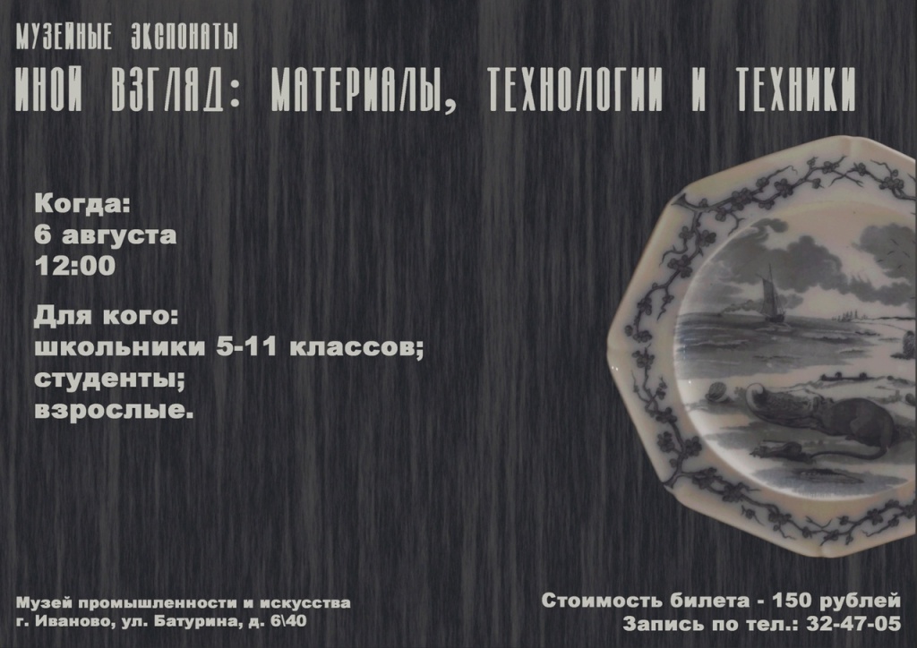 Музей промышленности и искусства (ул. Батурина 6/40) приглашает на новую тематическую экскурсию «Музейные экспонаты. Иной взгляд: материалы, технологии и техники».