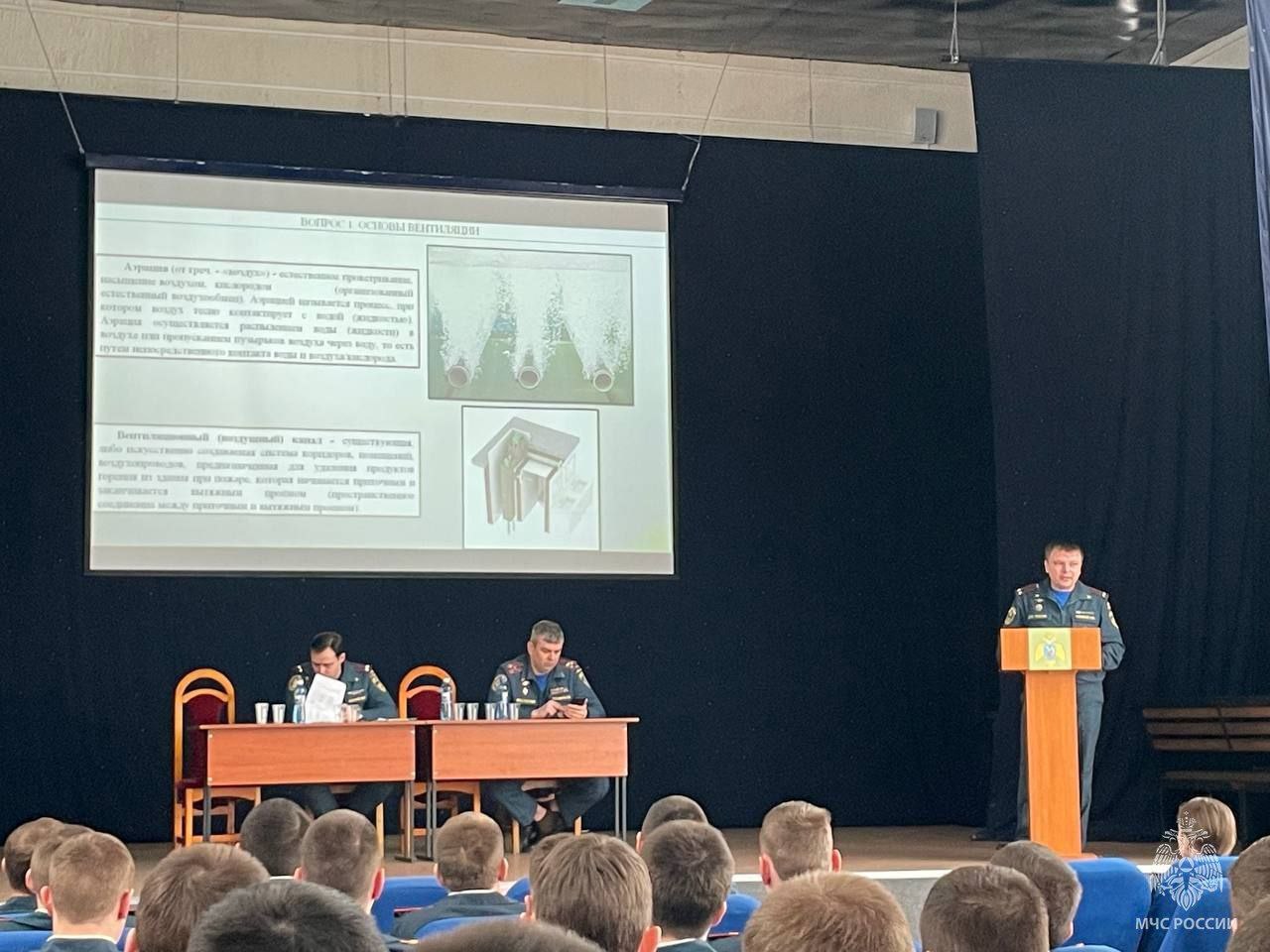 Проведена лекция по особенностям организации и проведения тактической вентиляции в зданиях и сооружениях при тушении различных пожаров и отработаны практические приемы по управлению газообменом на пожаре, в том числе по удалению дыма и снижению температуры внутри объекта пожара для обеспечения безопасной работы ствольщиков на боевых позициях.