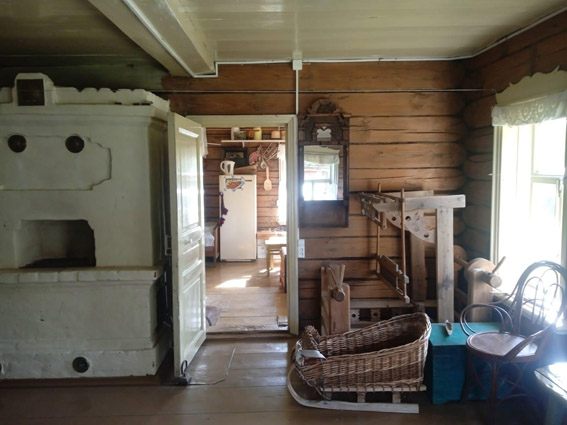 В глаза также бросаются добротные деревянные лавки вкруговую вдоль всех стен. С их помощью происходило объединение всех основных зон избы: красного угла, печи и периферии. Здесь чувствуется атмосфера, наполненная домашним уютом и теплом. В деревенском доме много вещей, которые кажутся для современного человека странными и необъяснимыми, как, например, металлическое кольцо над печкой. Кто его вмонтировал в балку и для чего? Мария Александровна объясняет: «Нужно оно, чтобы подвешивать к потолку детскую люльку. Саму кроватку в наших краях, делали из бересты». Кстати, таковая также хранится у Марии Александровны, дно сгнило - остались стенки и ручки. «Люльку, ее еще называли зыбка, подвешивали на длинной гибкой жерди - очепе. Сама очепа проходила через то самое кольцо под потолком, а к ней уже крепилась детская люлька. Для матери такая система была очень удобна: не нужно было постоянно раскачивать - толкнула один раз, а зыбка потом целый час сама ребенка укачивает». А в это время женщина могла заняться хозяйственными делами. Например, рукоделием.