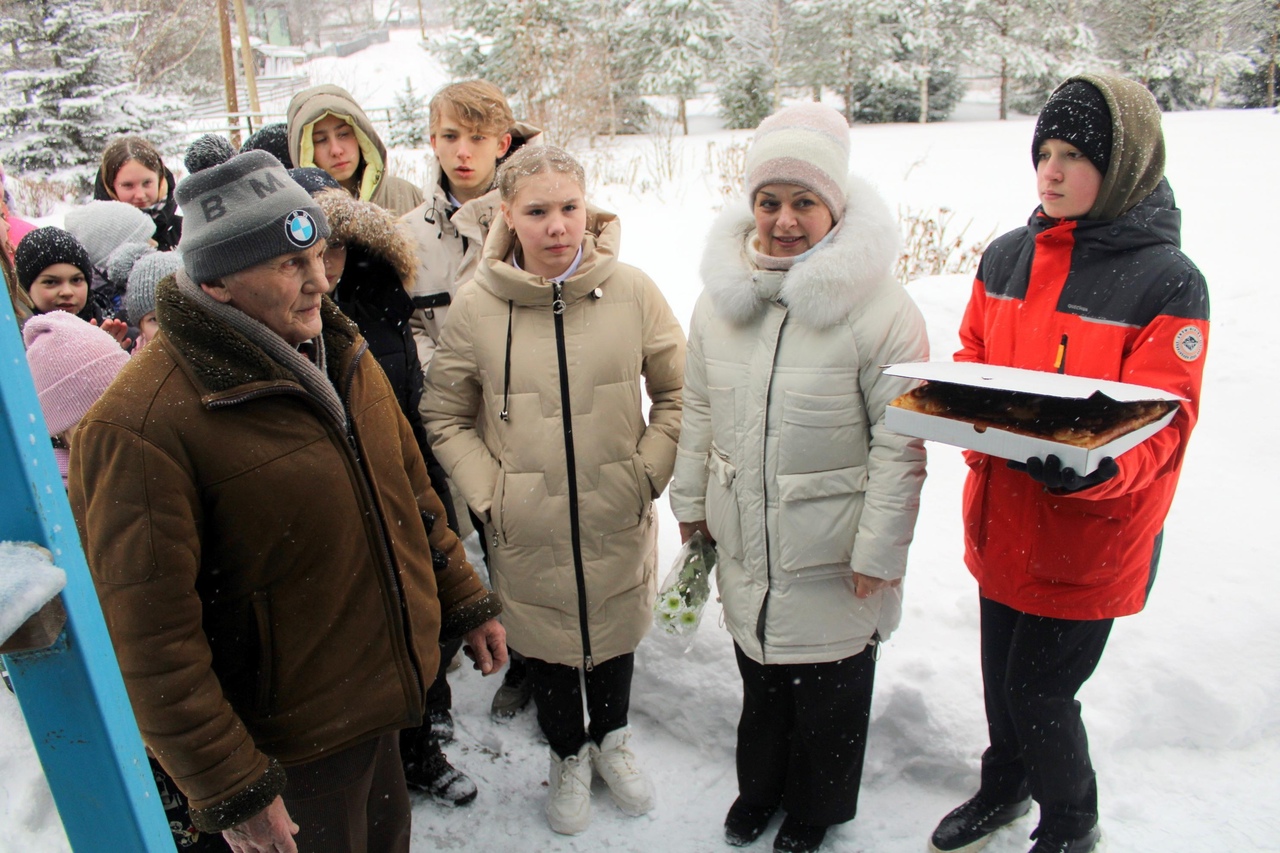 Чтобы ребята не замерзли, Евгений Михайлович позвал их в свой уютный теплый дом погреться у настоящей русской печки. В ответ на его гостеприимство, ученики пригласили ветерана в школу, где также прошло памятное мероприятие и небольшой концерт.