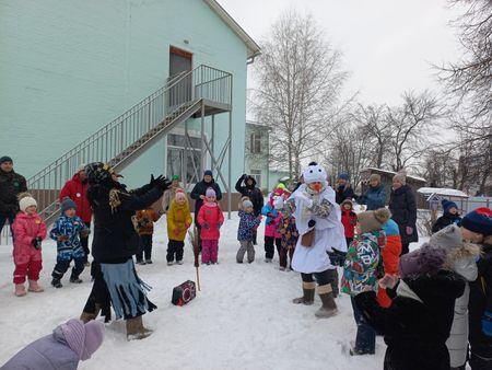 На снимке: веселые игры с Бабой Ягой и Снеговиком.