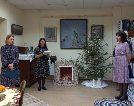 Работники библиотеки Елена Николаевна Смирнова и Оксана Геннадьевна Разина провели для собравшихся небольшой экскурс в историю появления в России новогодних ёлочных игрушек и открыток.