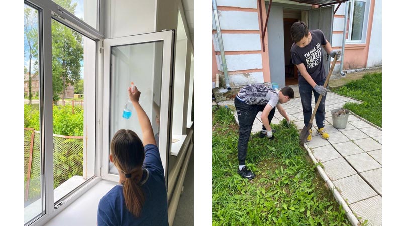 Ученики Новолеушинской средней школы наводят порядок на пришкольной территории, пропалывают клумбы. В школьных кабинетах ребята моют окна, стены, обновляют школьную мебель.
