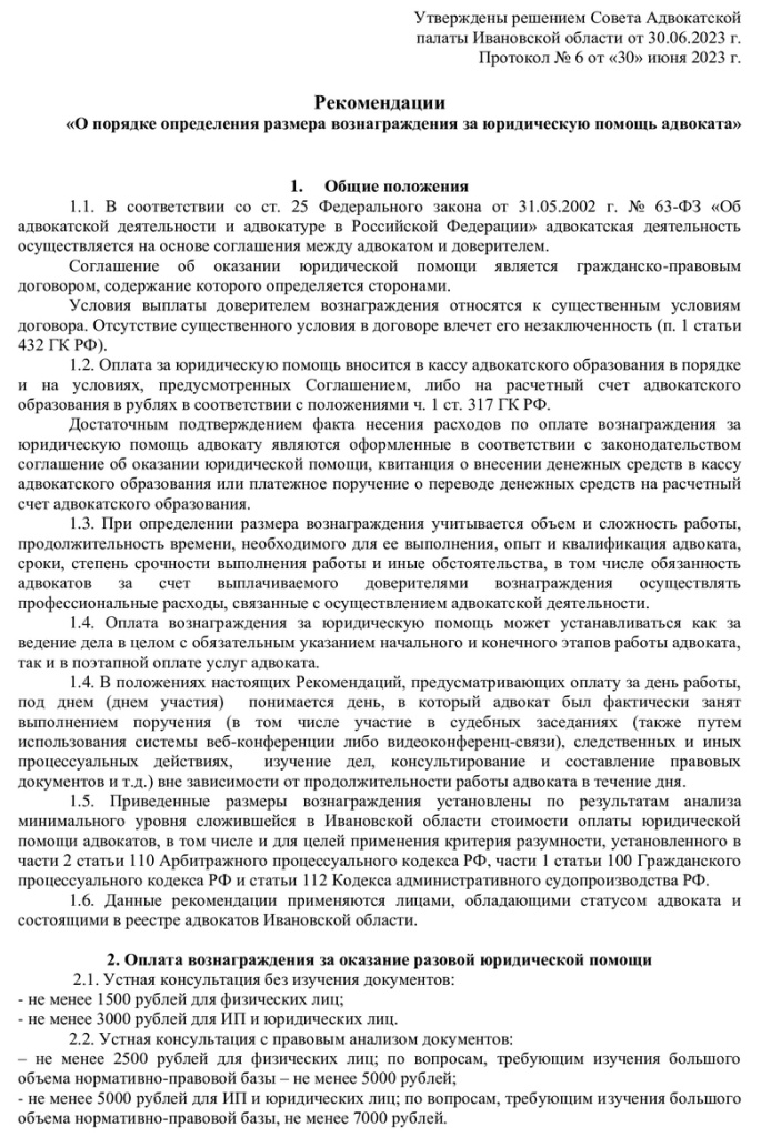 Адвокатская палата Ивановской области обнародовала актуальные на сегодняшний день рекомендации «О порядке определения размера вознаграждения за юридическую помощь адвоката». Документ утвержден решением совета АПИО 30 июня 2023 года и содержит упоминания обо всех возможных и невозможных случаях, когда вам может потребоваться услуги адвоката и информацию какими финансами на это стоит располагать.