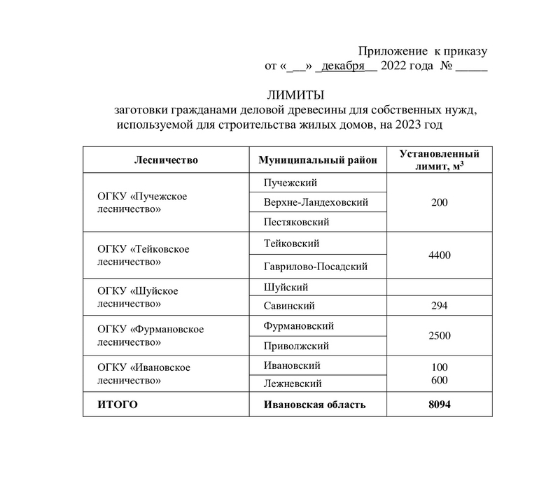 Приказом комитета Ивановской области по лесному хозяйству от 27 декабря 2022 года утверждены лимиты заготовки гражданами древесины для собственных нужд, используемой для строительства жилых домов, на 2023 год. Общий годовой объем составляет 8 094 кубометра. Причем более половины лимитов на деловую древесину расписано на жителей Гаврилово-Посадского и Тейковского районов – 4 400 кубометров.