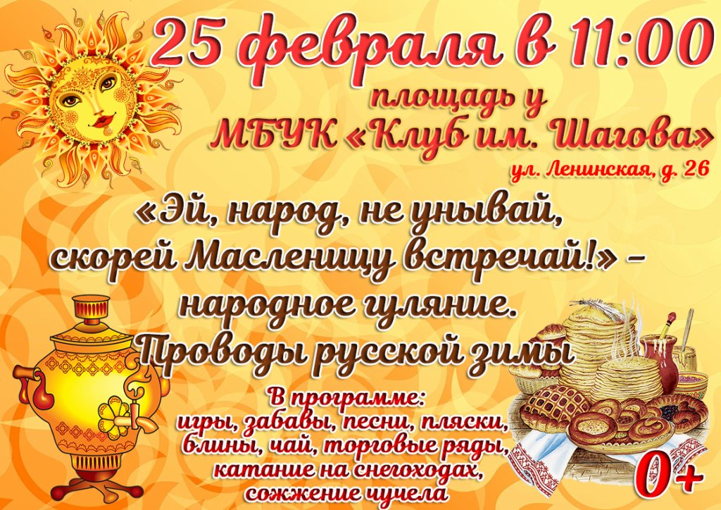 25 февраля в 11.00 в микрорайоне Гольчиха на площади у клуба имени. Шагова пройдет программа «Эй, народ, не унывай, скорей Масленицу встречай!».