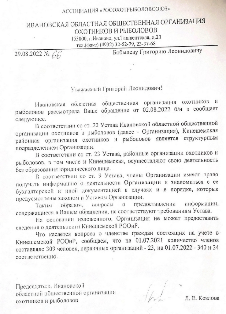 Ивановская областная общественная организация охотников и рыболовов (ИООООиР) и скандалы вокруг неё периодически в паблике. Самый громкий – времён губернаторства Михаила Меня, когда общество возглавлял Григорий Воропаев . И вот опять, но уже под руководством его бывшего главного бухгалтера – Лидии Козловой, которая после ухода Григория Воропаева сначала была временно исполняющим обязанности председателя общества, а потом временное стало постоянным. Правда, полыхнуло в этот раз не в областном центре, а в Кинешме , но быстро долетело до Иванова. И хотя на первый взгляд кажется, что конфликт касается только Кинешемского отделения общества охотников и рыболовов, которым руководит Сергей Смирнов, – это не так. Приехавшие в редакцию охотники сидят напротив меня и очень-очень эмоционально говорят, что Смирнов хоть неправ, но он только исполняет волю ивановского председателя Лидии Козловой, которая решила сделать из общественной организации частную лавочку и чуть ли не приватизировать государственную охоту. А по мнению моих гостей – уже приватизировала.