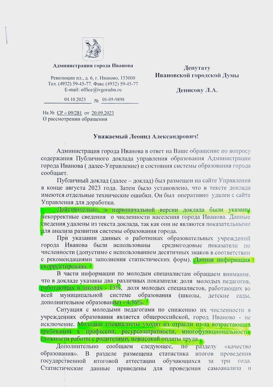 Администрация города Иваново депутату Ивановской городской Думы Денисову Л.А