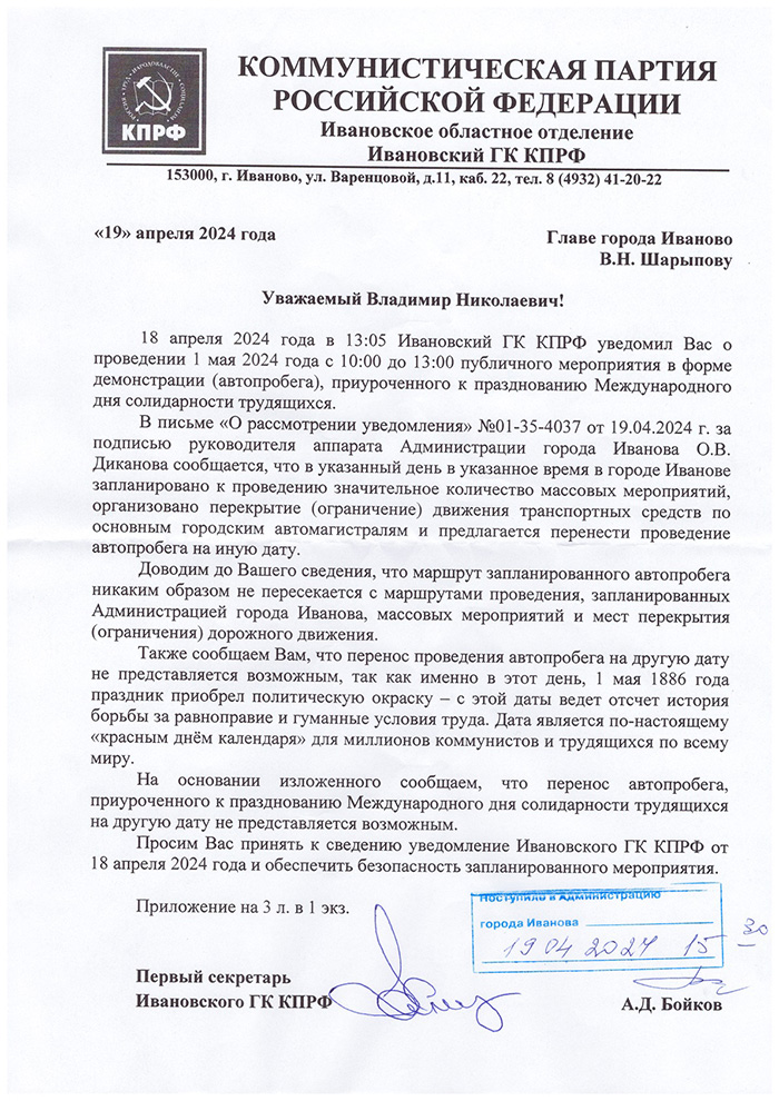 Тем не менее, направили ответное письмо в Администрацию города Иваново, отметив что маршрут запланированного автопробега Ивановского горкома КПРФ и представителей лево-патриотических организаций города никак не пересекается с маршрутами проведения массовых мероприятий, запланированных Администрацией города Иванова.