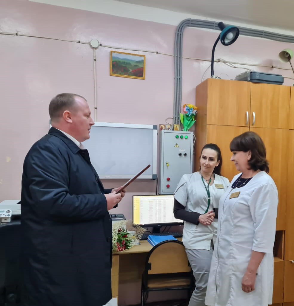 Перед награждением Александр Бойков выразил слова благодарности Ирине Валерьевне за ее многолетний труд и неравнодушно трепетное отношение к своей работе, детишкам, находящимся в диспансере на лечении.