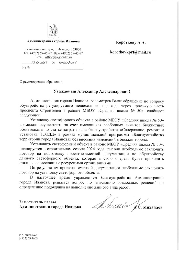 В письме экс-заместителя главы администрации г. Иваново А.С. Михайлова от 08.02.2024 г. №03-02/8-207 сообщается, что установка светофорного объекта в районе МБОУ «Средняя школа №50» возможно осуществить за счёт имеющихся свободных лимитов бюджетных обязательств по статье затрат плана благоустройства…без внесения изменений в бюджет города.
