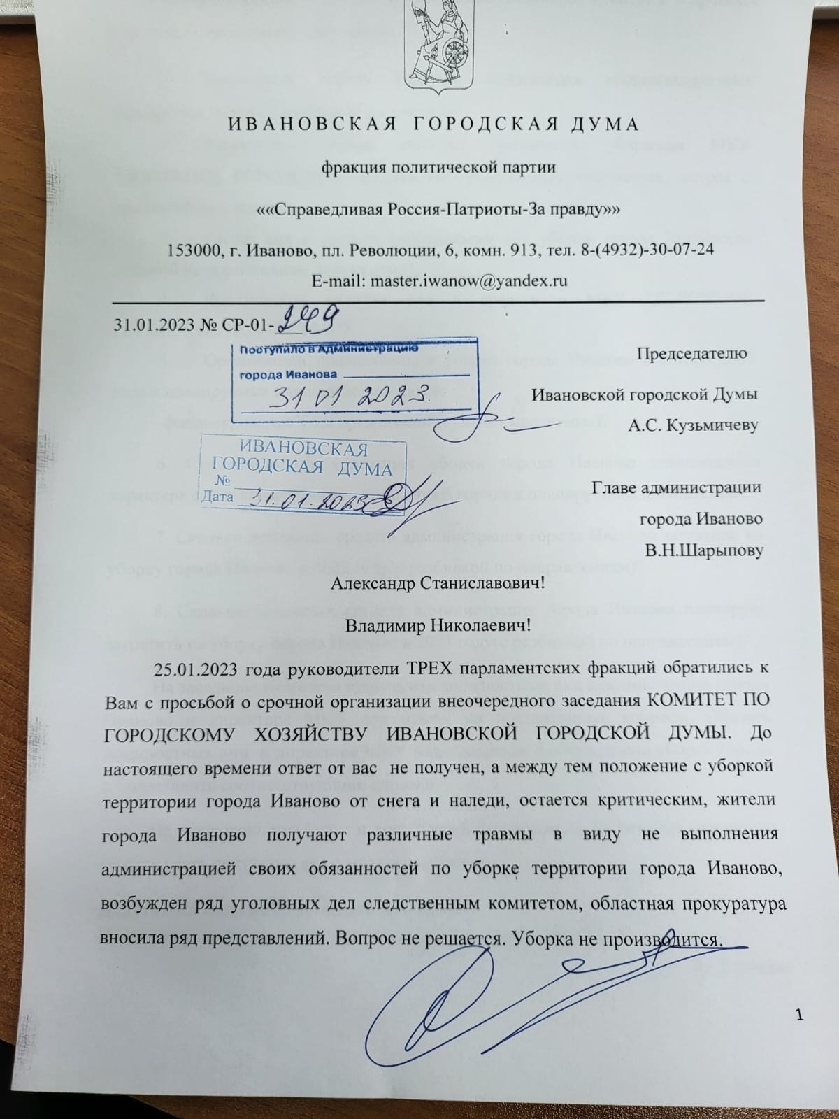 Прошла неделя, председатель Ивановской думы Кузьмичев А.С. игнорирует обращение депутатов 3 фракций, не собирает внеочередное заседание комитета, не интересуется проблемами жителей города Иваново.