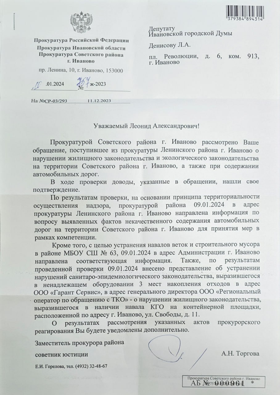 Депутат Ивановской городской Думы Денисов Леонид Александрович благодарит прокуратуру Советского района за деятельность по защите прав жителей местечка Сортировка города Иваново.