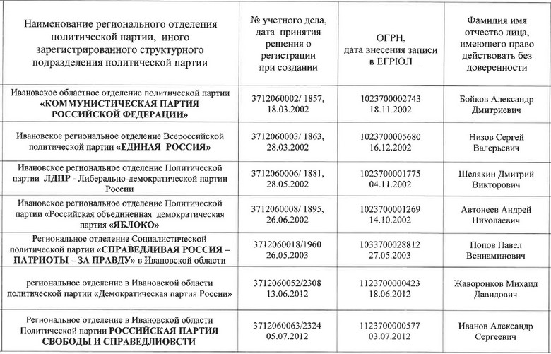 На сегодняшний день в Ивановской области осталось 20 региональных отделений политических партий (список см. ниже). Год назад их было 22. В небытие ушли реготделения «ПАРНАСа» и партии «Альтернатива для России».