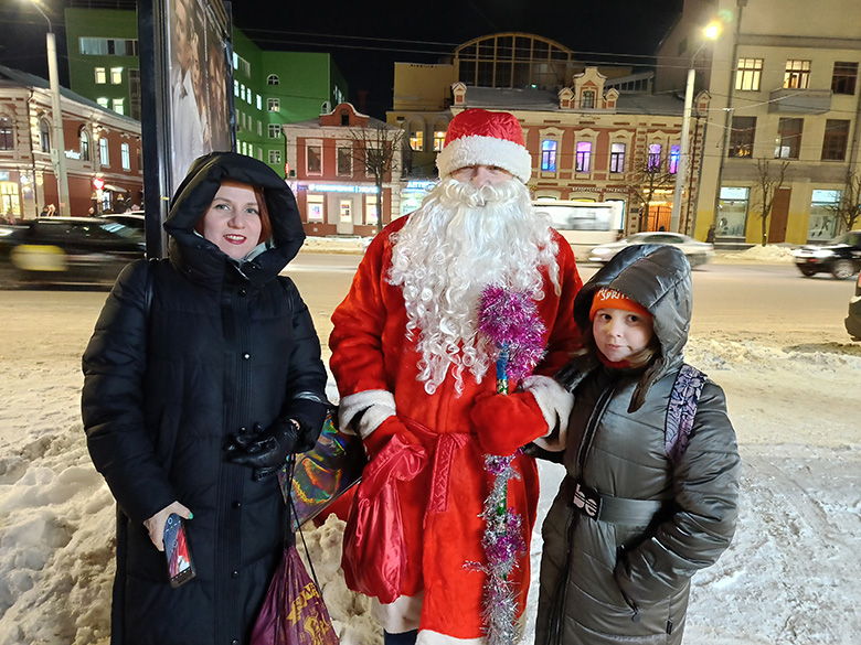 Люди, встречая сказочных персонажей, улыбаются, делятся предновогодним настроением и благодарят за поздравления. Дети разного возраста и взрослые подходят к участникам акции, выражают желание сделать совместное фото.