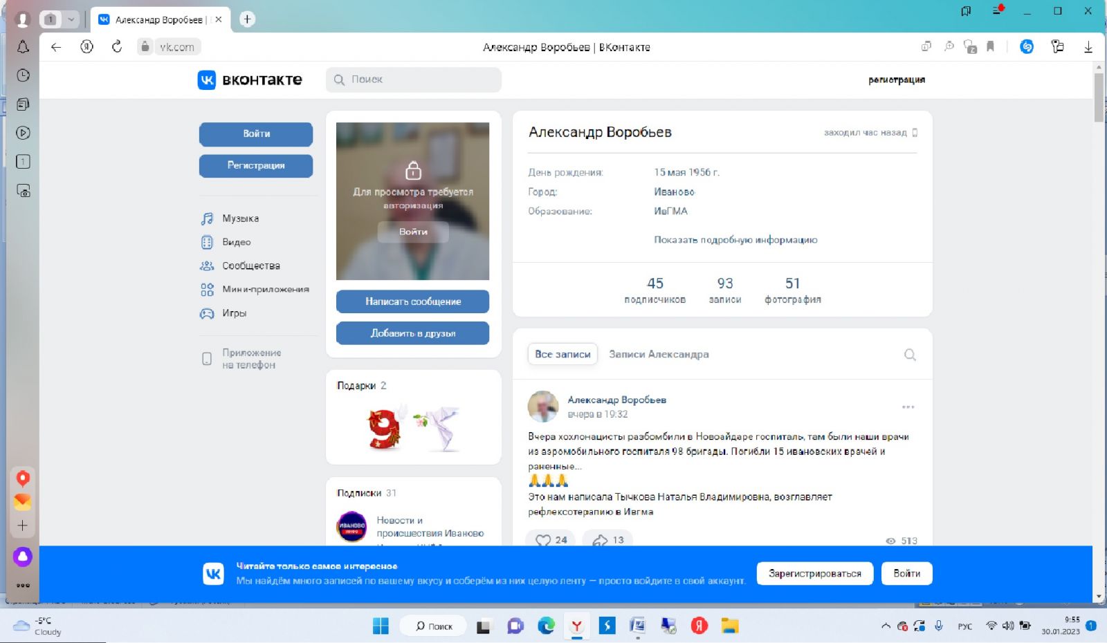 30 января 2023 года, член Совета по делам ветеранов боевых действий при Председателе Социалистической политической партии "СПРАВЕДЛИВАЯ РОССИЯ – Патриоты – ЗА ПРАВДУ" (Ивановская область), председатель Ассоциации "Воины Отечества" Михаил Дорофеев в сети Интернет обнаружил недостоверную информацию о якобы гибели 15 ивановских врачей из аэромобильного военного госпиталя ВДВ в Луганской области.