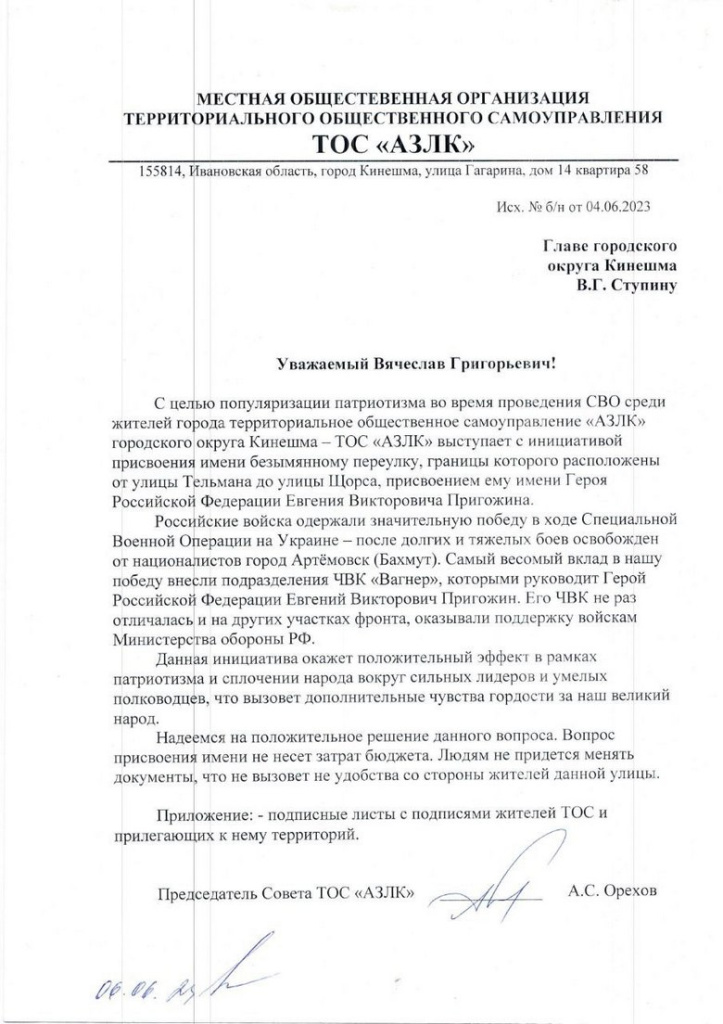 Лидер «Коммунистов России» Ивановской области, по совместительству депутат Кинешемской гордумы и руководитель кинешемского ТОС «АЗЛК» Александр Орехов от лица своего ТОС предложил назвать один из переулков Кинешмы в честь создателя ЧВК «Вагнер», Героя Российской Федерации Евгения Пригожина.