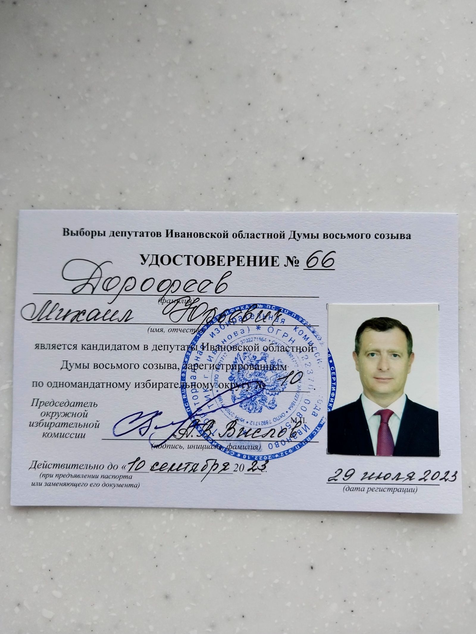 29 июля 2023 года члену Совета и Бюро Ивановского регионального отделения партии " СПРАВЕДЛИВАЯ РОССИЯ – ЗА ПРАВДУ " Михаилу Дорофееву в окружной избирательной комиссии было торжественно вручено удостоверение кандидата в депутаты Ивановской областной Думы восьмого созыва по одномандатному избирательному округу № 10.