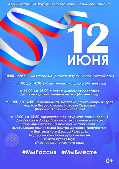 Афиша праздничных мероприятий, посвящённых Дню России и Дню работников текстильный и лёгкой промышленности