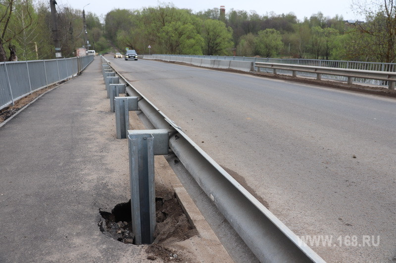 Провалился тротуар. Два года капитального ремонта моста в Кинешме. Два подрядчика.